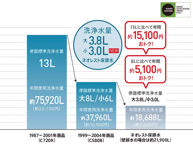 ネオレストは1回あたりの洗浄水量がわずか3.8L(床排水の場合。壁排水は4.8L)。